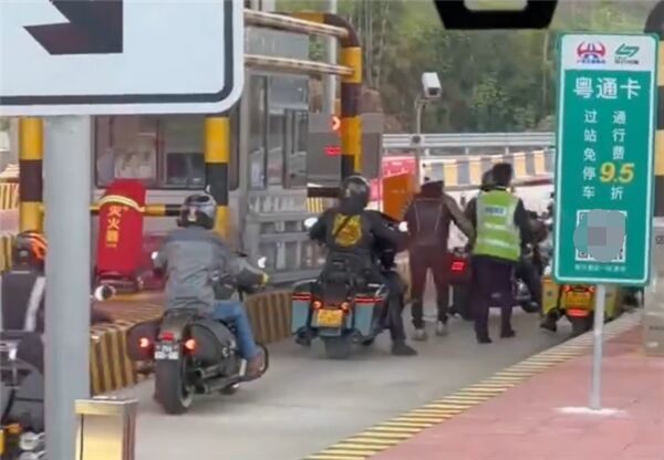 从现场画面看,一摩托车车队想要通过收费站上高速,遭到了工作人员的劝阻,但他们不仅不听,还在集体闯岗。