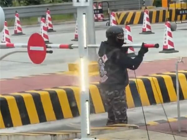 更令人气愤的是,其中一个身着骑行服、头戴头盔和面罩的男子甚至在摇晃着起降杆,想要将它推开或者掰向一边,而且一边操作一边还向后方招手,示意车队其他成员尽快通过。