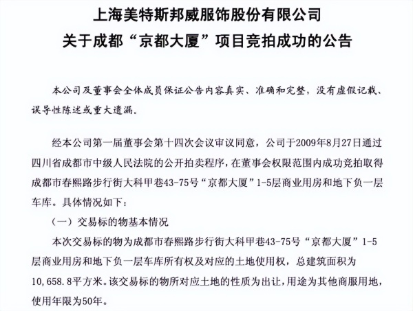 据公告,该交易标的包含5层楼,总建筑面积为1.07万平方米。公开资料显示,该店铺地处成都黄金地段春熙路商圈的“京都大厦”。正观新闻记者致电该门店及美特斯邦威官方客服,均无人接听。地图上显示该门店目前仍在正常营业中。