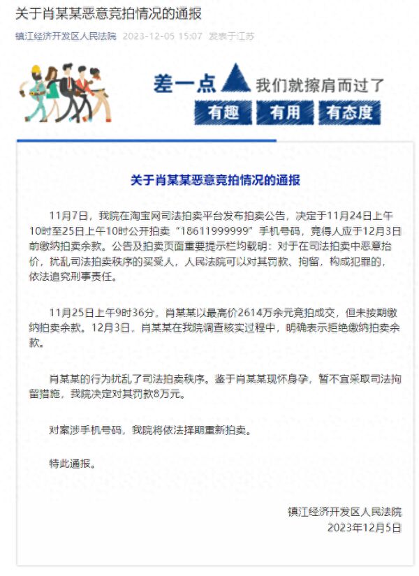 11月7日,我院在淘宝网司法拍卖平台发布拍卖公告,决定于11月24日上午10时至25日上午10时公开拍卖“18611999999”手机号码,竞得人应于12月3日前缴纳拍卖余款。公告及拍卖页面重要提示栏均载明:对于在司法拍卖中恶意抬价,扰乱司法拍卖秩序的买受人,人民法院可以对其罚款、拘留,构成犯罪的,依法追究刑事责任。