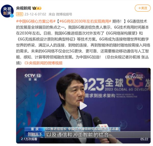 6G通信技术的发展是全球瞩目的焦点之一。我国6G推进组负责人表示,6G技术商用时间基本在2030年左右。日前,我国6G推进组首次对外发布了《6G网络架构展望》和《6G无线系统设计原则和典型特征》等技术方案。6G将成为连接物理世界和数字世界的桥梁,满足从人的连接,到物的连接,再到智能体的随时随地按需接入网络的需求。未来的6G网络不仅会比5G更快、更可靠,还需要推动移动通信与人工智能、感知、计算等跨领域融合发展。为中国6G加油!(总台央视记者孙蓟潍 张丛婧)