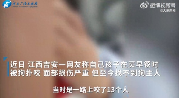12月6日,据大象新闻报道,近日,江西吉安一网友称,自己的孩子在买早餐时被狗扑咬,面部损伤严重缝90多针,但至今找不到狗主人,希望得到网友帮助转发。