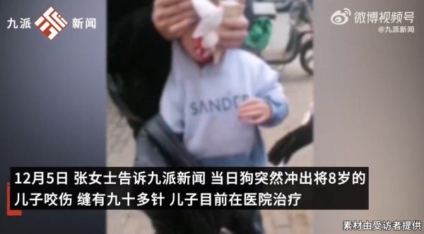 12月5日,男童母亲告诉九派新闻儿子今年8岁,当日此狗突然冲出将买早餐的儿子扑倒在地咬伤,伤在额头、面部、嘴巴,伤口加起来有15厘米长,缝了90多针。