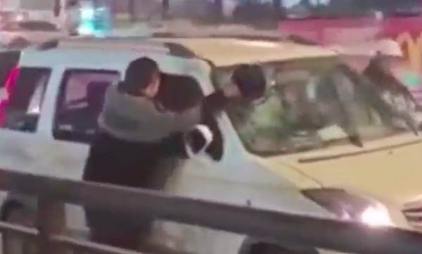 现场视频显示,男子在车外左手扒着私家车的车窗,不断怒斥车内驾乘人员,右手则拿头盔将挡风玻璃砸碎,随后私家车速度越开越快,男子被拖行双脚离地。