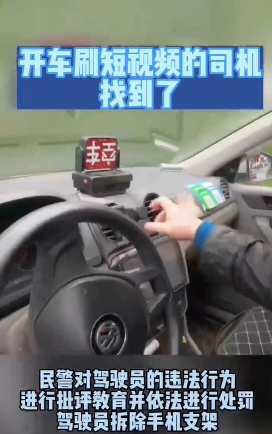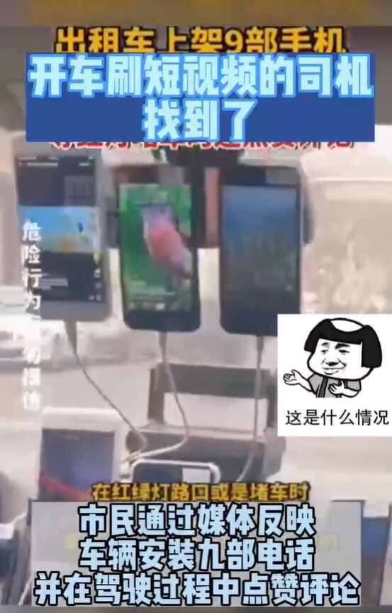 近日,湖北武汉。女子通过媒体反映,一出租车上安装了9部手机,这9部手机都在播放视频,的哥还在驾驶过程中给视频点赞、发评论。武汉交警立即开展查缉,将该车辆及驾驶员查获。民警对驾驶员的违法行为进行了批评教育,并且依法对其进行处罚,要求驾驶员拆除手机支架。