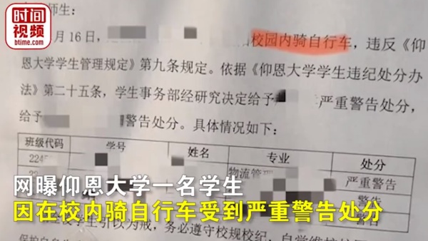 网传文件显示,2月16日,该学校有3名学生在校园内骑自行车,违反《仰恩大学学生管理规定》第九条规定,依据《仰恩大学学生违纪处分办法》第二十五条,学生事务部经研究决定给予1名学生严重警告处分,2名学生警告处分。