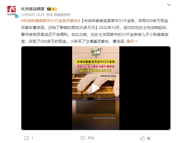 据长沙政法频道12月6日报道,2022年10月,武汉的刘女士向法院起诉,要求被告吕某返还不当得利。原来在此之前,刘女士发现家中的31斤金条被儿子小张偷偷变卖,获取了500多万的现金。小张买了兰博基尼豪车、奢侈品,还给了帮卖的朋友吕某20多万元。刘女士报警后将兰博基尼豪车退掉,而吕某在返还5万元后,余下16万元拒不返还。