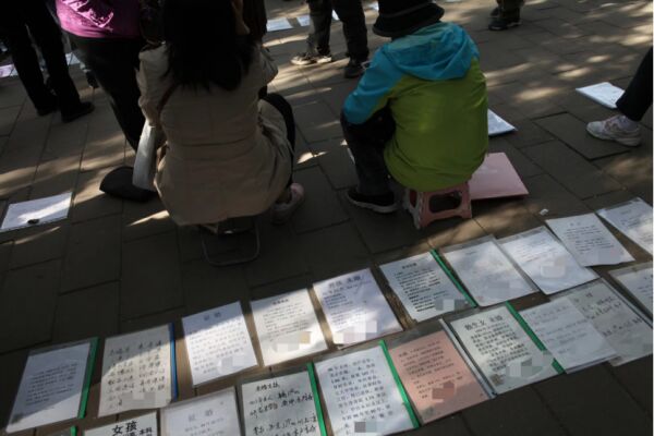 中山公园的相亲角,是北京规模最大的一处,每周四和周日下午,超过八千份征婚启事在这里等待配对,数百名家长在此寻找、驻足。