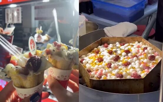 报道称,近期有台湾网民在社交媒体发文称,她去台北士林夜市寻觅美食时,发现有商家在卖大陆传统点心梅花糕。这款点心有红豆泥、芋泥和起司玉米等三种内馅可供选择。商家在糕点上铺上一层用糯米粉制成的浆,再铺上红枣、萝卜干、玉米和小汤圆等,最后盖上铁盖加热等待,即可出炉。