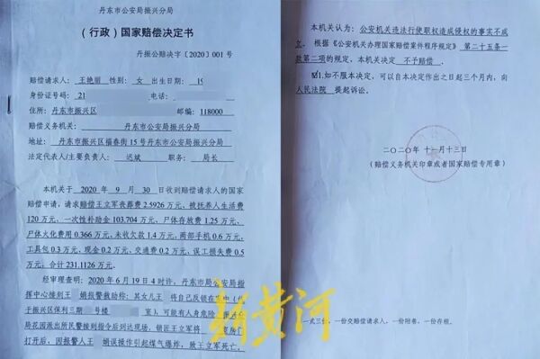 2020年9月,王艳丽向丹东市公安局振兴分局提出国家赔偿申请,请求该局赔偿王立军丧葬费2.5926万元、被抚养人生活费120万元、一次性补助金103.704万元等各项费用共计约231万元。2020年11月,丹东市公安局振兴分局作出《(行政)国家赔偿决定书》,其中载明“公安机关违法行使职权造成侵权的事实不成立。根据《公安机关办理国家赔偿案件程序规定》第二十五条一款第二项的规定,本机关决定不予赔偿”。
