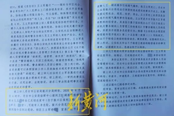 王艳丽告诉新黄河记者,庭审期间,一审、二审法院未对警方现场采取的处警措施进行调查,也未对处置程序是否“科学、规范、得当、合法”进行调查。在二审庭审中,王艳丽一方提交了《申请法院调查取证申请书》,申请法院调取“6·19爆炸案事故调查报告”。警方在回答法官问话时承认存在多部门签发的事故调查报告,并承诺庭后一周之内提供。然而,警方始终未能提交这份关键的证据材料。王艳丽一方认为,警方作为行政机关负有举证责任,但拒不提供本案关键证据“6·19爆炸案事故调查报告”,应当承担举证不能的不利后果,“至今三年过去了,调查报告也没有出具。”