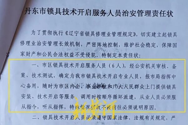 在这份《责任状》中,记者看到其中载明“市区锁具技术开启服务人员(6人),经公安机关审核、备案、技术测试,确定为我市锁具技术开启专业人员,报市局指挥中心备用,随时为市区内企、事业单位和广大人民群众上门提供锁具安装、技术开启等服务。调用时按顺序循环派遣,从业人员必须服从指令,听从指挥,特殊情况因故不能前往必须说明原因。”在这份《责任状》的落款,盖有丹东市公安局治安管理支队特业科的公章以及王立军的签名。