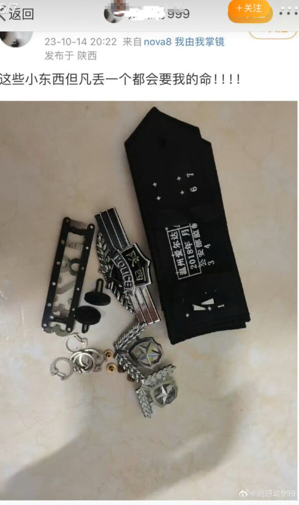 而根据该网民提供的其他截图显示,涉嫌“人肉”的人疑似西安市公安局阎良分局的一名警务人员。这位ID“别感动999”的网民曾在2023年10月14日发布一条微博,展示了警务人员的相关工作标识和证件信息,包括肩章、胸牌、胸扣等。根据其展示的身份标识,记者看到其警务编号疑似为“FJ8233”。