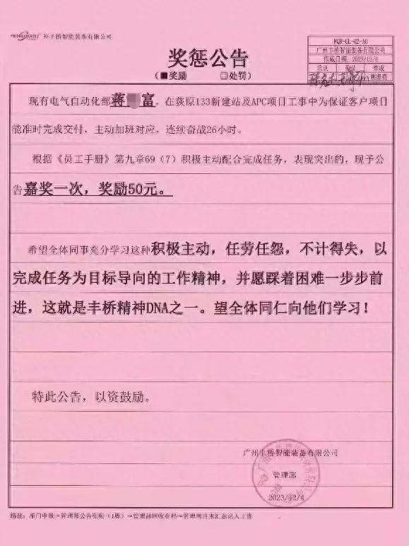 此前的《奖惩公告》显示,电气自动化部蒋某某主动加班,连续奋战26小时。根据《员工手册》有关规定,奖励50元。此公告配有公章,落款单位为广州丰桥智能装备有限公司管理部,时间为12月4日。