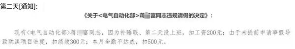 之后,网传一份《关于蒋某某同志违规请假的决定》。文件写道,蒋某某因补睡眠、第二天没上班,扣工资200元;因未提前申请事假导致耽误项目进度,扣绩效300元;本月全勤不达成,扣500元。