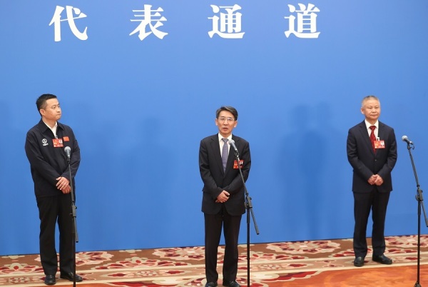 全国人大代表孙泽洲、薛其坤、万步炎(从左至右)接受媒体采访。中国日报记者 邹红 摄