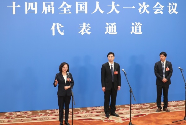 全国人大代表刘小蓉、孙东明、姜鹏接受媒体采访。中国日报记者 邹红 摄
