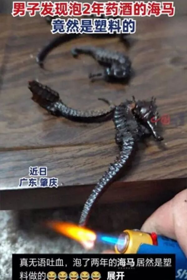 据了解,两年前,王先生从外省的朋友那里购买了一些海马海龙,准备用来泡制药酒。然而,最近在清理药材时,他惊讶地发现这些原以为是海马海龙的物品竟然是塑料制成的。它们既不易撕断,还会在火焰下收缩,并散发出一股浓重的塑料味。