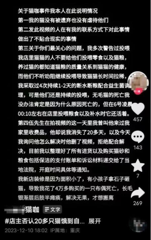 12月10日,该猫咖店经营者在其个人社交账号上发布情况说明,对相关网传说法予以回应。
