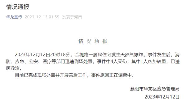 大皖新闻讯 据“华龙宣传”微信公号消息 12月12日20时18分,濮阳市华龙区金堤路一居民住宅发生天然气爆炸。事件发生后,消防、应急、公安、医疗等部门迅速到场处置。事件中4人受伤,其中1人伤势较重,已送医救治。