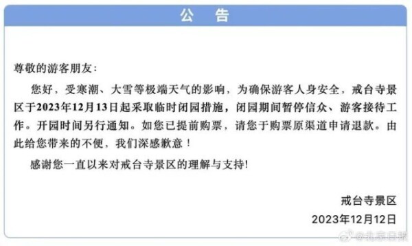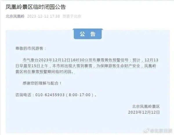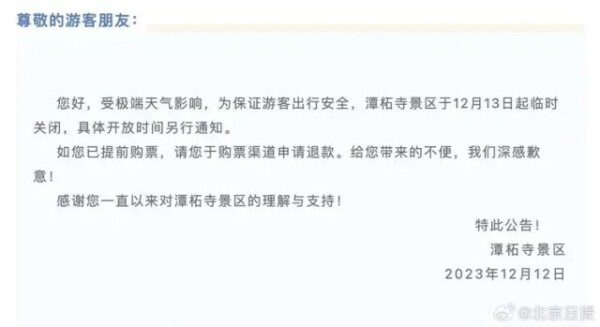 目前,北京已有多家景区发布通知,13日起临时关闭