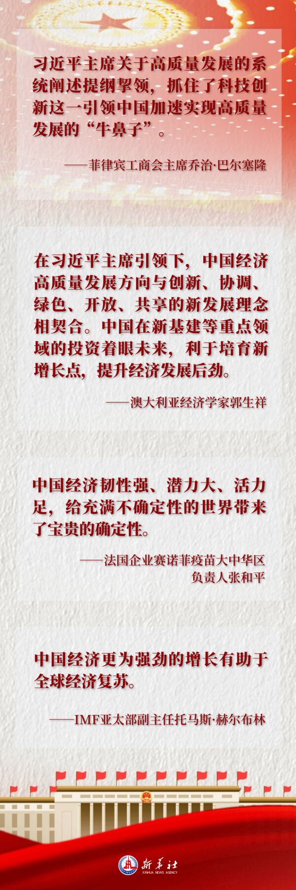 中共中央总书记、国家主席、中央军委主席习近平5日下午在参加他所在的十四届全国人大一次会议江苏代表团审议时强调,高质量发展是全面建设社会主义现代化国家的首要任务。接受采访的外国人士对中国经济高质量发展蓝图充满期待,看好中国创新活力与开放红利,倍加期待中外合作共赢。