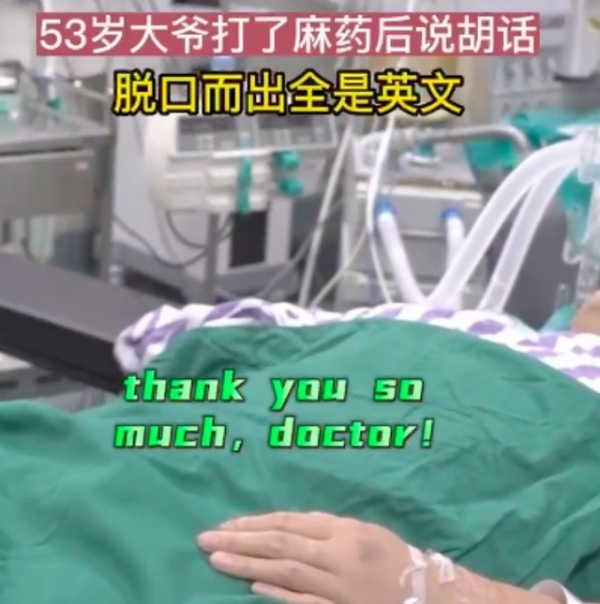 导读:近日,在四川成都,一位53岁的大爷打了麻药后开始说胡话,脱口而出全是英文,引发关注。对此,大爷的儿子称,自己也是第一次听到。
