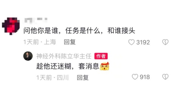 还有网友调侃称“问他你是谁,任务是什么,和谁接头?”陈立华主任也搞笑回应:趁他还迷糊,套消息。