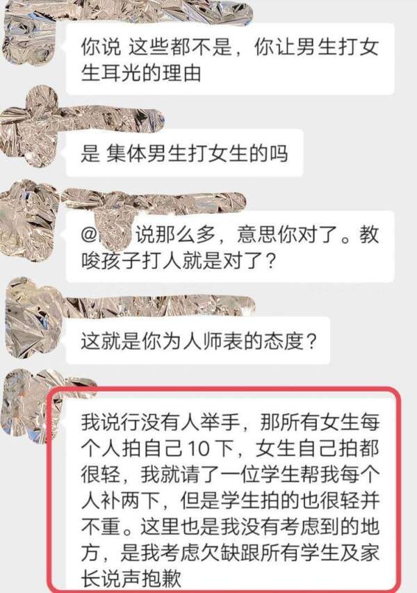 该班英语老师朱老师则回复:近日有多位女生在其课堂吃东西,老师提醒后未改正。8日下午的英语课上仍有女生吃东西。她让未吃东西的女生举手,无人举手,于是便让班上所有女生每个人拍自己10下。因女生拍得很轻,她就请了一位学生帮每个人补两下,但是学生拍得也很轻并不重。朱老师随后在群中道歉。