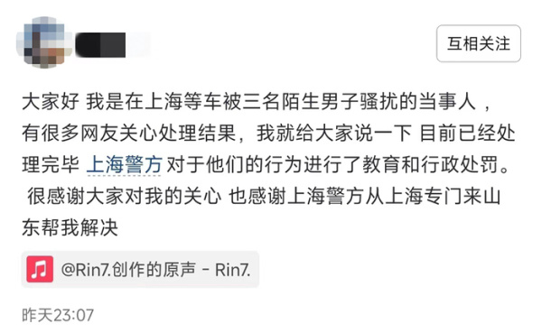13日晚,满女士通过社交平台发消息称,事情目前处理完毕,上海警方已对三名涉事男子的行为进行了教育和行政处罚。记者从有关部门证实了该说法。目前,曝光三名男子的视频已下架。