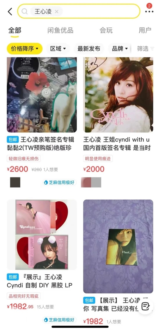 中新经纬记者以“王心凌”为关键词在闲鱼进行检索,有大量王心凌磁带、CD等周边商品在售,有的是二手,有的则是全新未拆,价格28元-300元不等,一些签名CD售价甚至超过了千元。