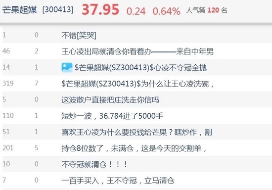 更有股民在股吧里喊话芒果超媒,“一百手买入,王不夺冠,立马清仓”“王心凌出局就清仓,你看着办”。