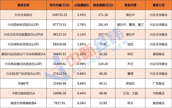▲芒果超媒基金持股明细(持仓市值排名前十的基金产品)。数据来源:同花顺iFinD