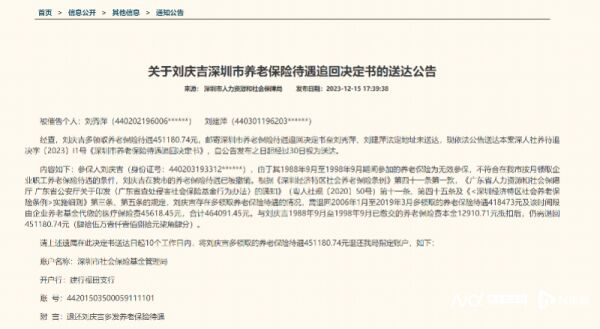 这份名为《关于刘庆吉深圳市养老保险待遇追回决定书的送达公告》显示,经查,刘庆吉多领取养老保险待遇451180.74元,邮寄深圳市养老保险待遇追回决定书至刘秀萍、刘建萍法定地址未送达,依法公告送达本案深人社养待追决字〔2023〕I1号《深圳市养老保险待遇追回决定书》,自公告发布之日起经过30日视为送达。