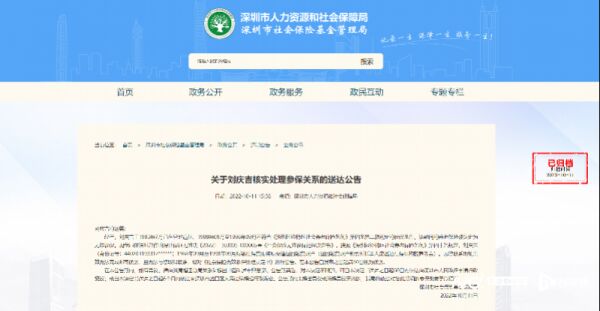 公告内容显示,参保人刘庆吉,由于其1988年9月至1998年9月期间参加的养老保险为无效参保,不符合在深圳市按月领取企业职工养老保险待遇的条件,刘庆吉在深圳市的养老保险待遇已被撤销。