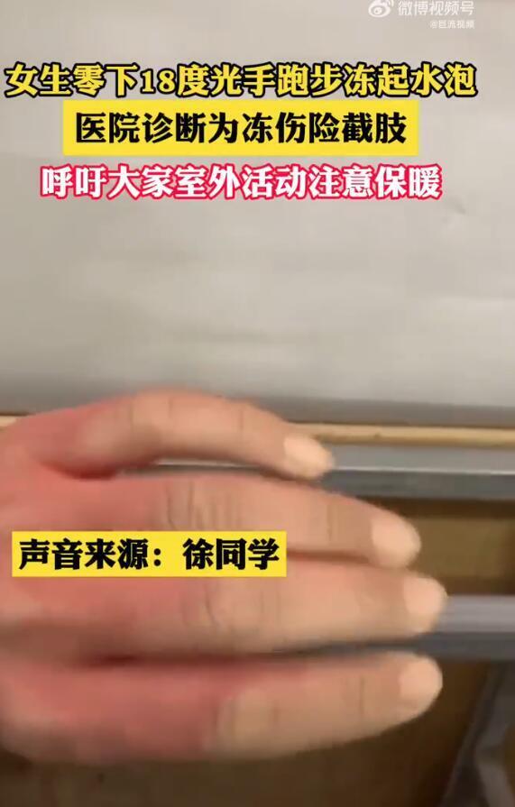 据巨流视频最新报道,12月19日,吉林通化,一女孩户外训练时未戴手套跑步,手被冻伤。