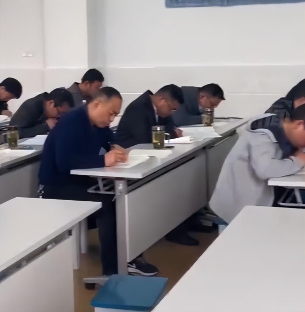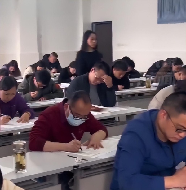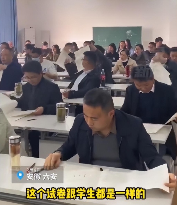 视频显示,在一间大教室里坐满了老师,他们像学生一样向后传递试卷,随后开始埋头解题,周围还有人监考。