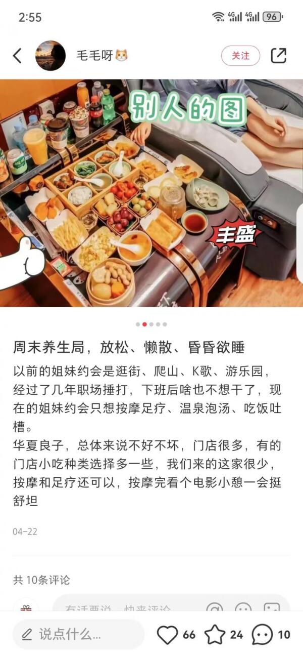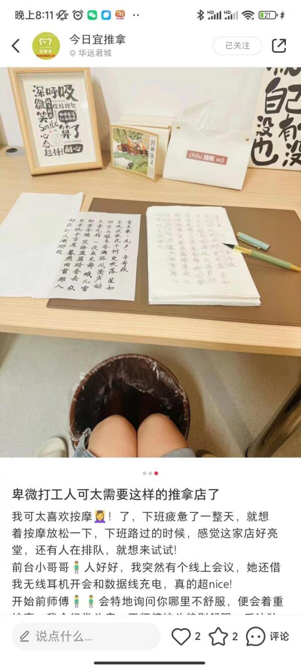 小小跟同学去的是一家“华夏良子”,那次体验让她感觉非常舒适,从此便加入到同学们的足疗按摩爱好群。