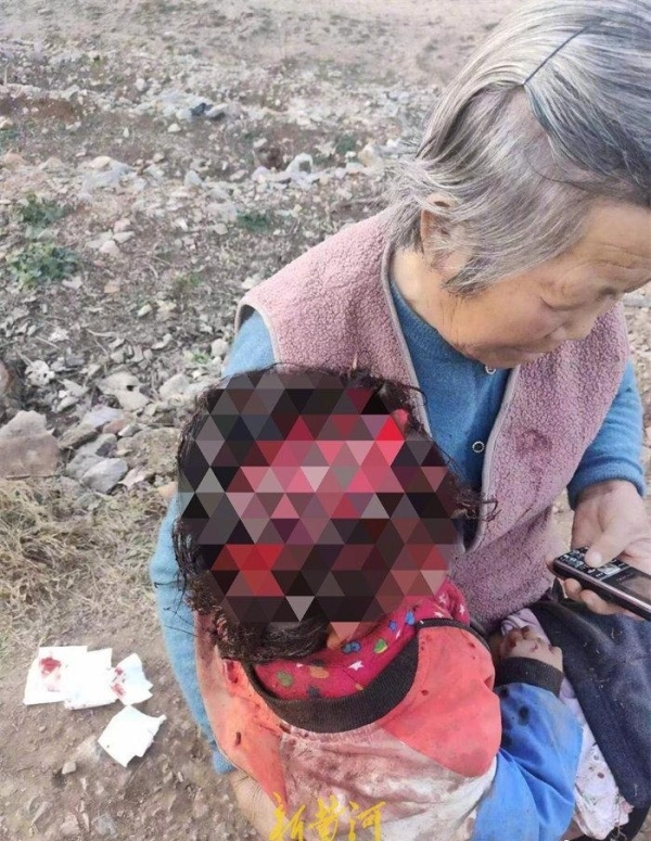 被咬后坐在奶奶怀里的瑶瑶
