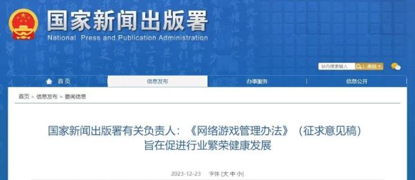 据《中国新闻出版广电报》报道,12月22日,国家新闻出版署起草的《网络游戏管理办法》(征求意见稿)向社会公开征求意见。