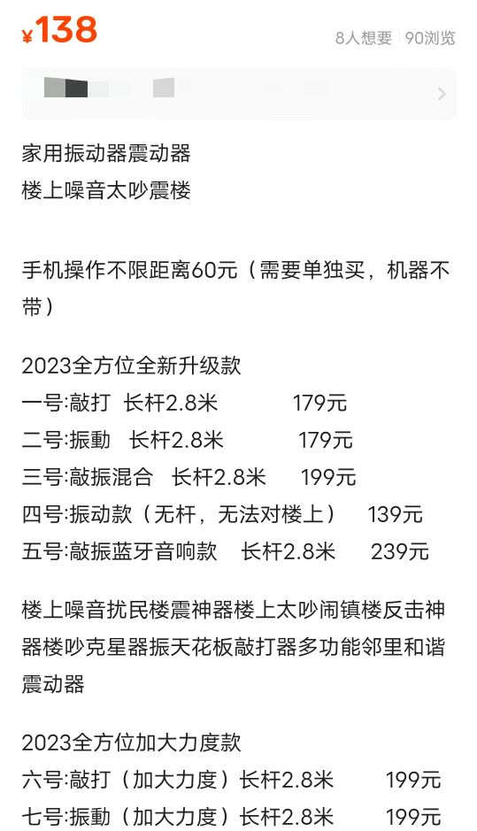 有一户商家疑似有大量震楼器出售,推出不同型号和价位的多款震楼器,其介绍中亦强调“楼上噪音扰民楼震神器、楼上太吵闹镇楼反击神器、楼吵克星器、振天花板敲打器、多功能邻里和谐震动器”。价格从几十元到数百元不等。