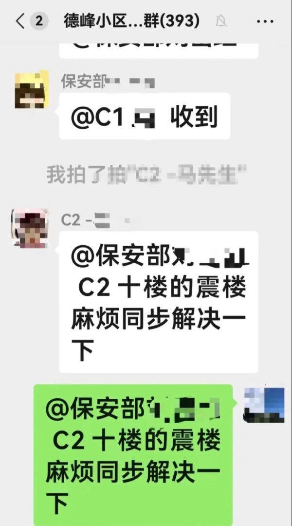 德峰小区湘诚现代物业品质部工作人员刘先生告诉了记者双方纠纷始末,他介绍,事情发生在7月。“9楼住的是业主的女儿,是一个年轻女孩,10楼是一户带小孩的。最开始因为楼上小孩吵闹,9楼住户就上去沟通理论,双方发生了冲突。后面女孩还拿了把刀上去,10楼的住户踢了9楼住户一脚,双方的矛盾就激化了。后面9楼住户就买了震楼器震楼上,然后自己搬走了,10楼住户过了两个月也搬走了。”刘先生说。
