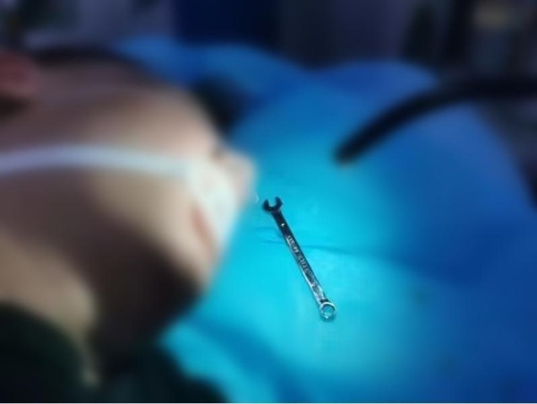 导读:近日,姚先生午睡张嘴打鼾时,4岁“熊孩子”贪玩,将20厘米长金属玩具扳手塞入其嘴里。迷糊中姚先生将扳手误吞入肚中尚不知情,直至第二天胃部不适才就医。