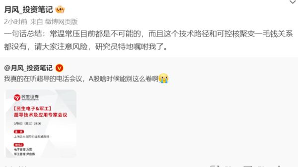 结论是什么呢?“常温常压目前都是不可能的,而且这个技术路径和可控核聚变一毛钱关系都没有,请大家注意风险。”