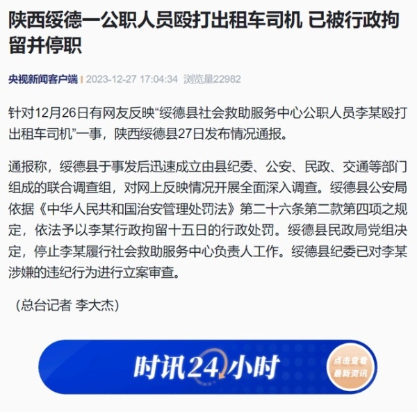 针对12月26日有网友反映“绥德县社会救助服务中心公职人员李某殴打出租车司机”一事,陕西绥德县27日发布情况通报。