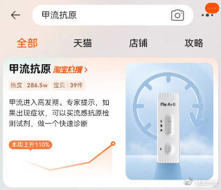 3月8日,人民日报健康客户端记者搜索百度指数发现,“甲流”搜索指数在3月6日达到345955最高峰,3月7日已有了明显的下降趋势。与此同时,“甲流抗原”相关搜索却登上淘宝热搜榜单,且本周搜索量上升110%,从实时销量来看,月销最高店铺已经销售甲流抗原试剂超2万盒。