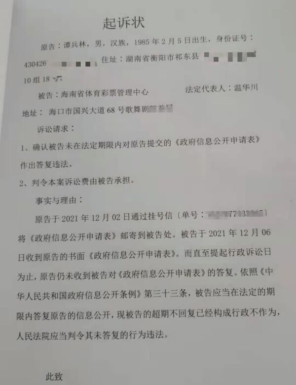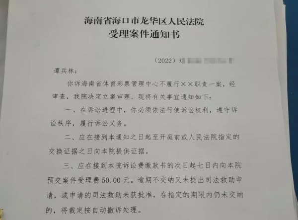 “但海南体彩中心没有在规定期限答复,等了快两个月都没有回复。”于是,2022年1月底,谭兵林向海口市龙华区人民法院提起行政诉讼,请求法院判令体彩中心履行职责。