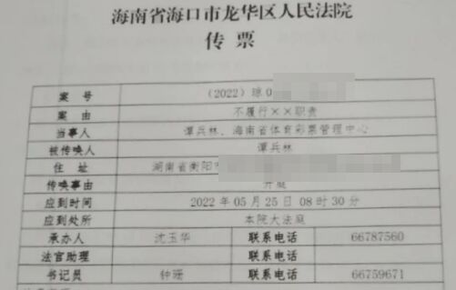 3月1日,谭兵林收到龙华区法院的传票,传唤他5月25日上午到法院开庭。