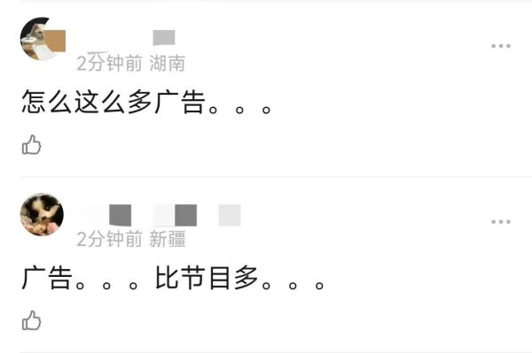 没想到晚会开始之后湖南卫视中间插入的广告也不少,没等看几个节目呢,一会儿一个中插广告,观众看得都烦了,吐槽这广告都比节目多。