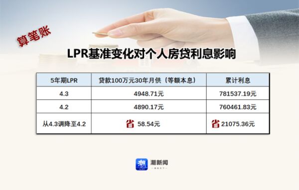 究竟能省多少?以杭州地区首套个人房贷为例,贷款金额100万元、期限30年、采用等额本息还款方式,利率下降之后,每月的利息可以减少近60元,30年总利息大约可省2万余元。